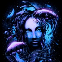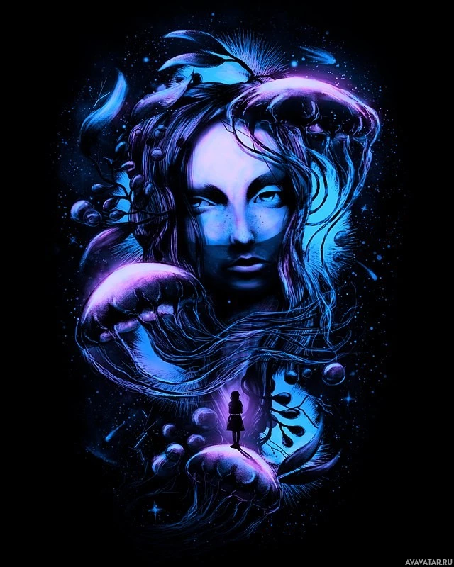 cool tones of blue and purple, which enhances the aquatic mood. There are also hints of darker colors and dark shapes around her face and ears, suggesting depth and possibly shadows or