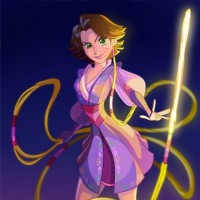 an animated character dressed in a costume resembling that of a samurai, holding a sword and what appears to be a scroll or book. The character has