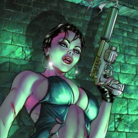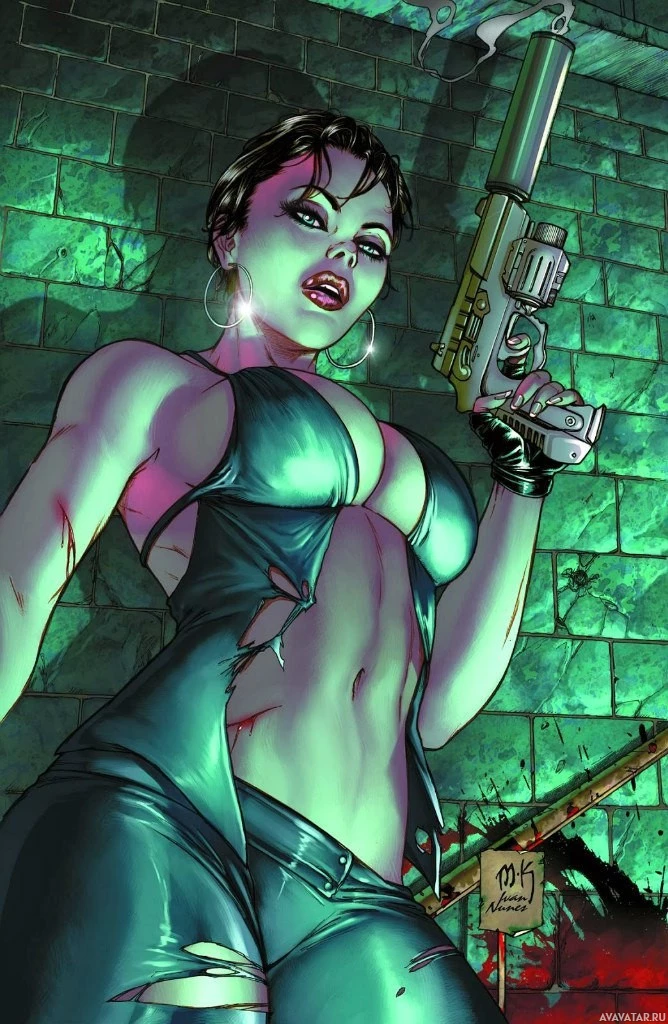 female figure is depicted in an action pose with one hand holding a pistol. She has a confident and intense expression on her face. There are also elements like brick walls, debris, and what appears to be a bloodstain near her right side, which might suggest