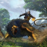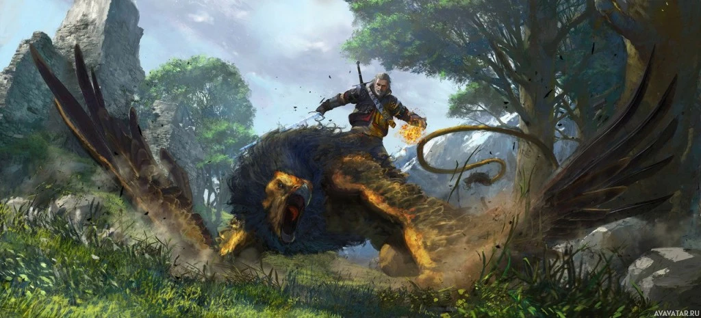 Geralt of Rivia. In the scene, Geralt is shown riding on the back of a griffon, which is