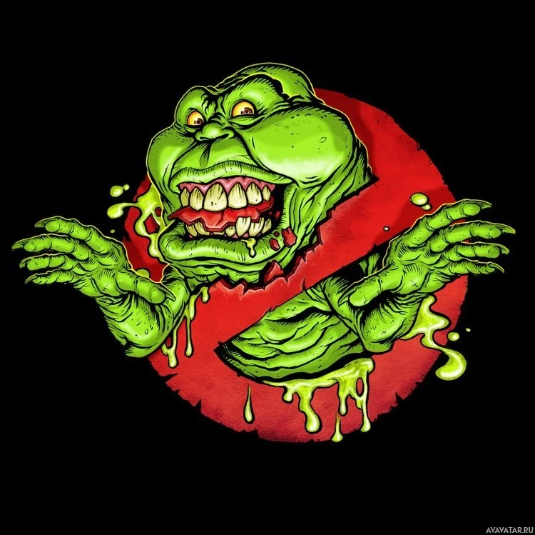 a graphic design that is reminiscent of the Ghostbusters logo. It features a cartoonish, green-skinned humanoid ghost with slime dripping from its mouth and neck, as if it's shouting or screaming. The ghost has