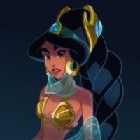 a confident stance and is set against a background that suggests a night-time or shadowy setting. This character is inspired by the Disney movie "Aladdin," where she is portrayed as