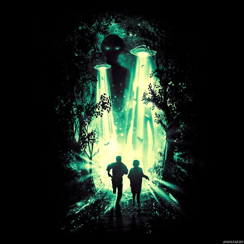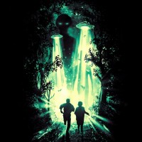 an alien figure looming over two individuals who appear to be running away from it. They are in what looks like a jungle or