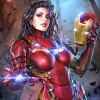 a female character wearing an Iron Man suit. She is standing in front of what appears to be an explosion or destruction, with the background featuring