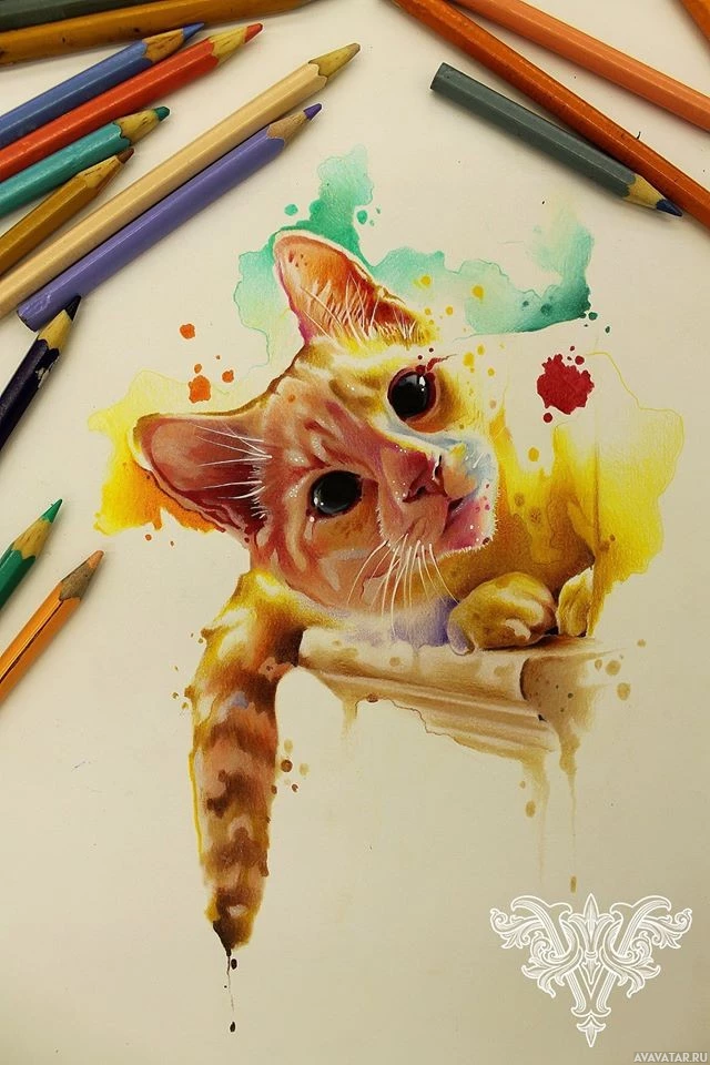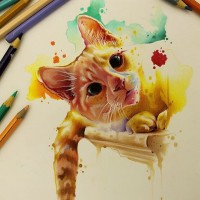 art supplies, including colored markers and pencils, suggesting that this image might have been created using those materials. The background has splashes of color that appear to be
