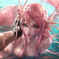 На картинке изображен анимированный персонаж с розовыми волосами, который выглядит как русалка. Она показана в подводной обстановке, окруженной пузырьками и рыбой. Персонаж имеет безмятежное выражение на лице и, кажется, непринужден в водной среде. Ее внешность включает в себя типичные элементы фэнтези, такие как мерцающие чешуйки, которые предполагают, что она предназначена для магического или мифического существа.