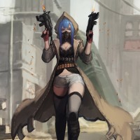 an animated character, a young female with blue hair and piercing eyes. She is wearing a hood that obscures her face, giving her a mysterious or rebellious appearance. The character is also dressed in a cloak that adds to the overall