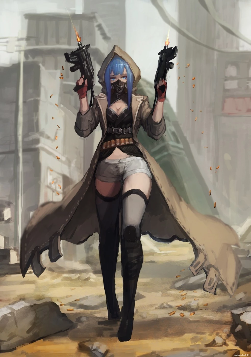 multiple guns pointed forward, ready for action. This suggests that the character might be involved in some sort of combat or