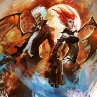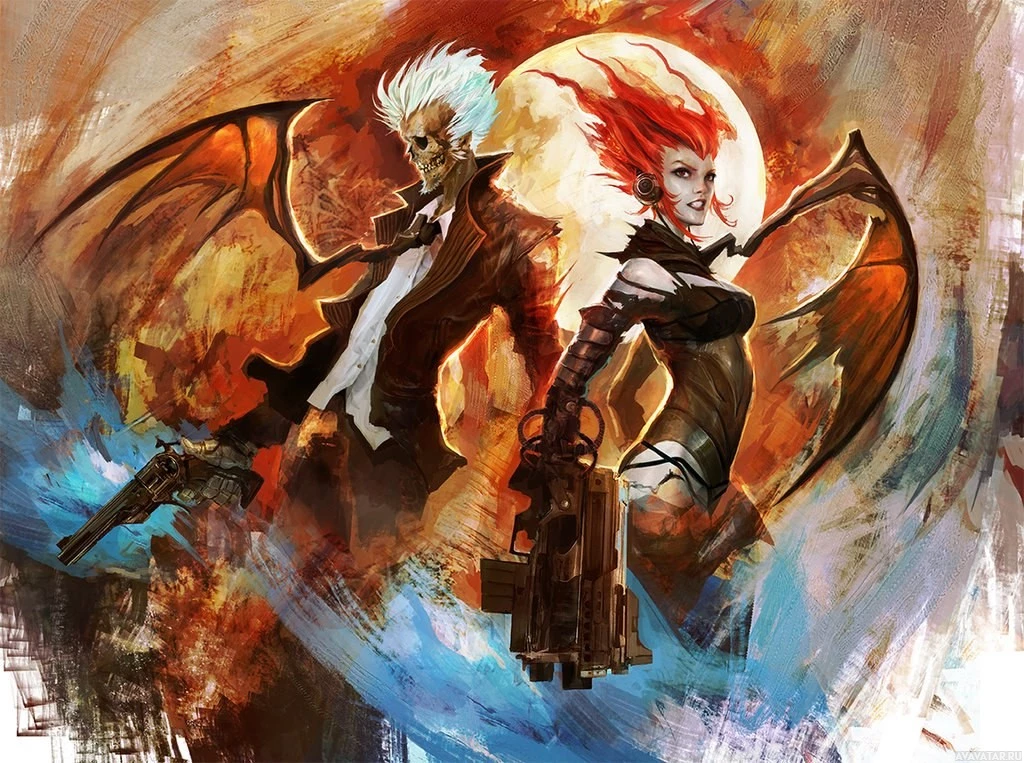 dynamic poses, suggesting they might be engaged in combat or adventure. Both characters have distinct features: one has white hair and is equipped with what appears to be a shotgun, while the other has