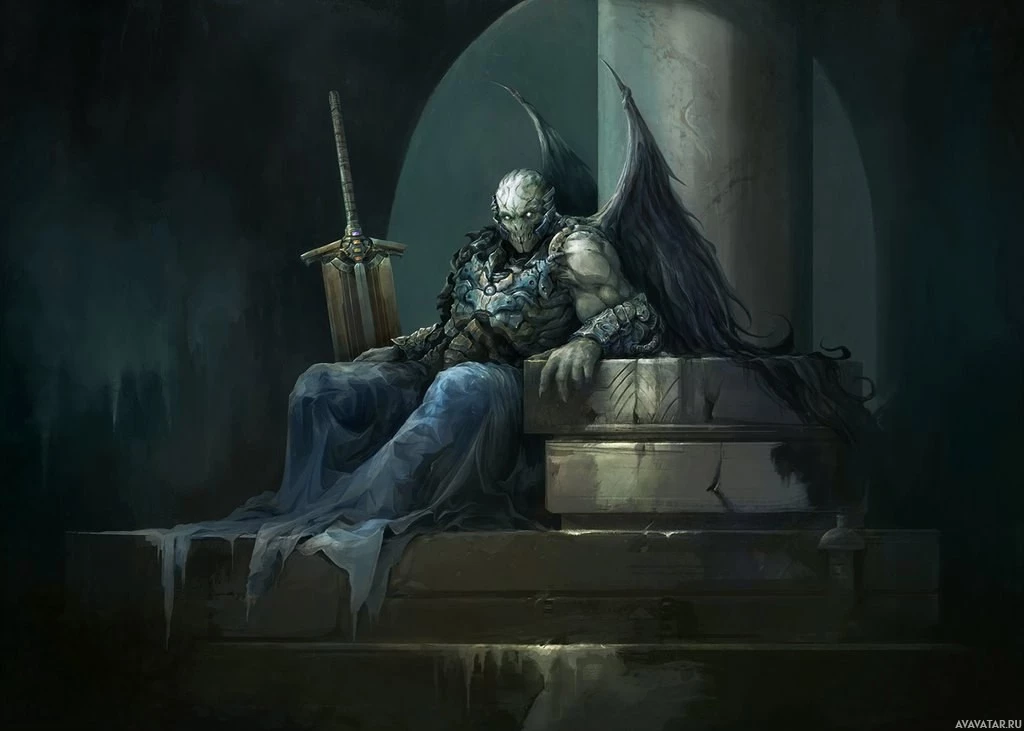 mythical figure. This character is seated on what looks like an ancient, possibly ruined throne, holding a staff with