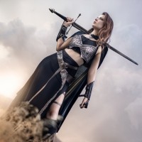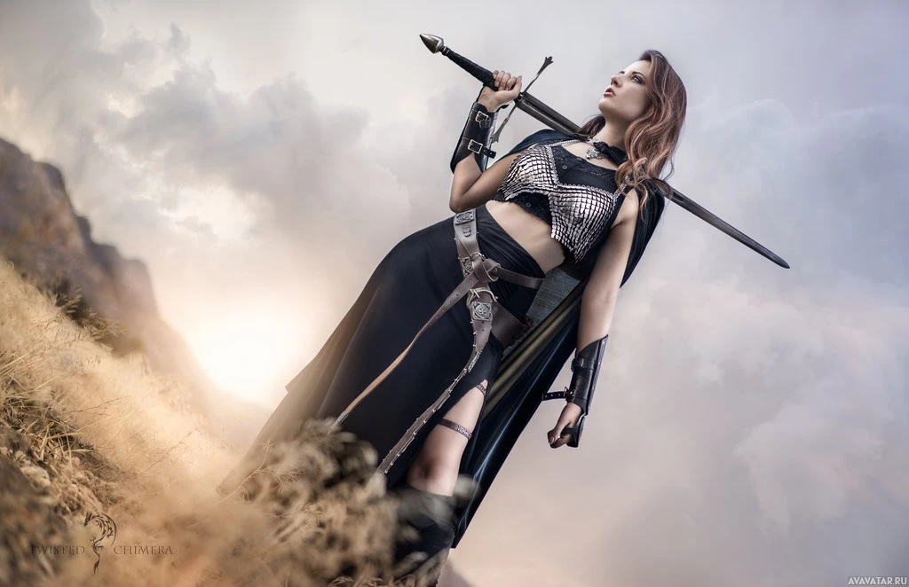 The image features a woman in a fantasy-themed outfit, holding a sword and standing on
