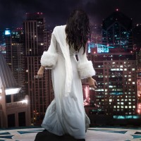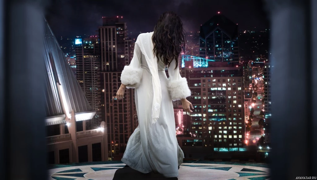 a long dress that appears to be fur-lined. She stands on a balcony or rooftop overlooking a nighttime