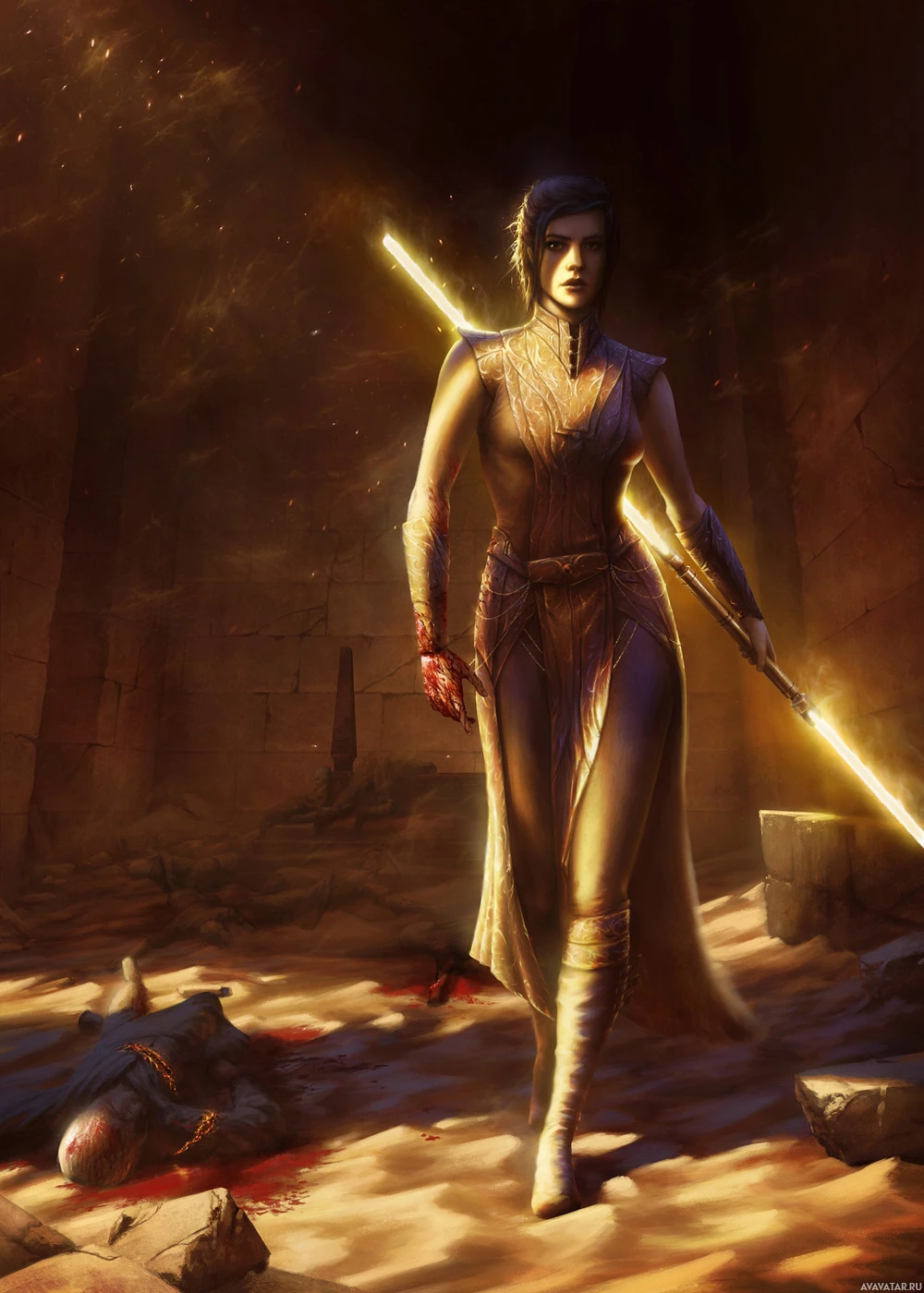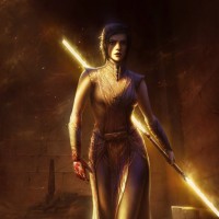 the Star Wars universe. Her attire and equipment suggest she might be a warrior or a Jedi. The artwork is rich in detail, with realistic