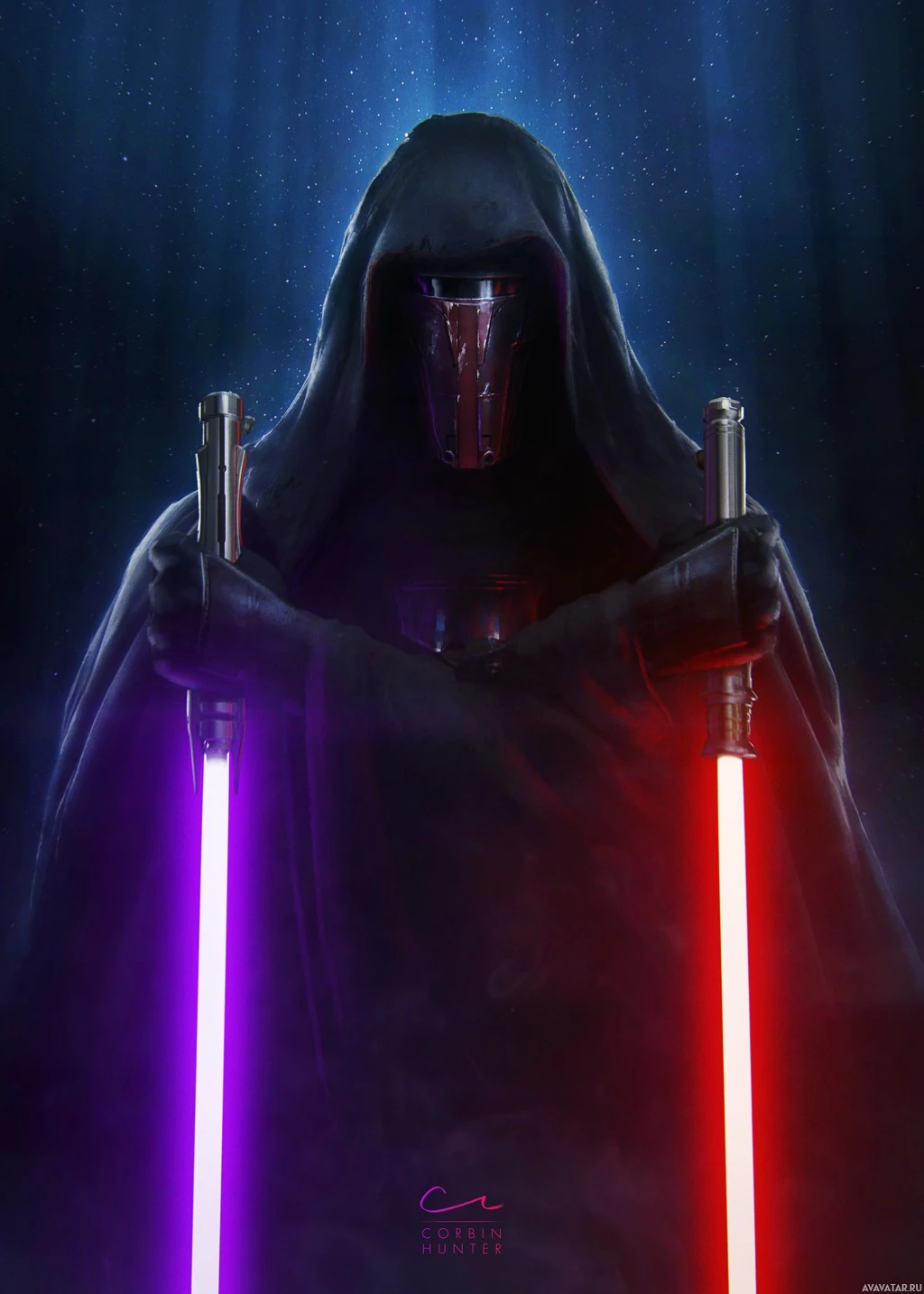 a hooded cloak and holding a red lightsaber, which are iconic elements associated with the Sith order in the Star Wars universe. The background gives a space-like ambiance with a starfield effect.