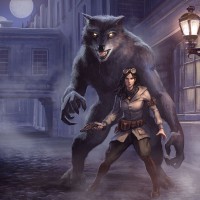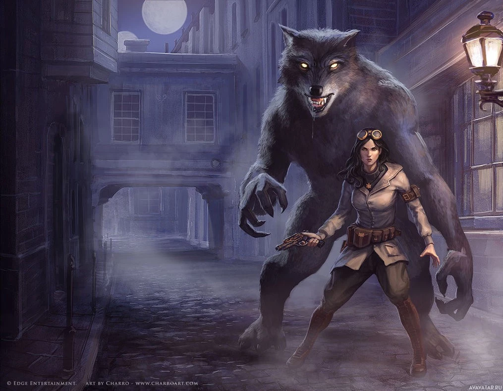 a young woman with brown hair is standing in front of a werewolf. She appears to be holding a weapon, possibly a sword or a gun, suggesting she might be prepared for combat. Both characters are set against a backdrop that resembles an alleyway at night, enhancing