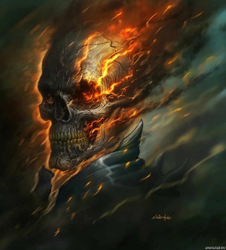 This image features a digitally altered representation of the iconic Ghost Rider, characterized by his fiery skull and flame-like hair. The background is dark with cloud-like patterns, which adds to the dramatic effect. The name "Ghost Rider" is often associated with this style of artwork.