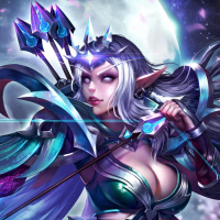 looking accessories. The background has a celestial theme with the moon visible above her head, and the colors are predominantly blue and purple, which may suggest a connection to magic or the night sky in this