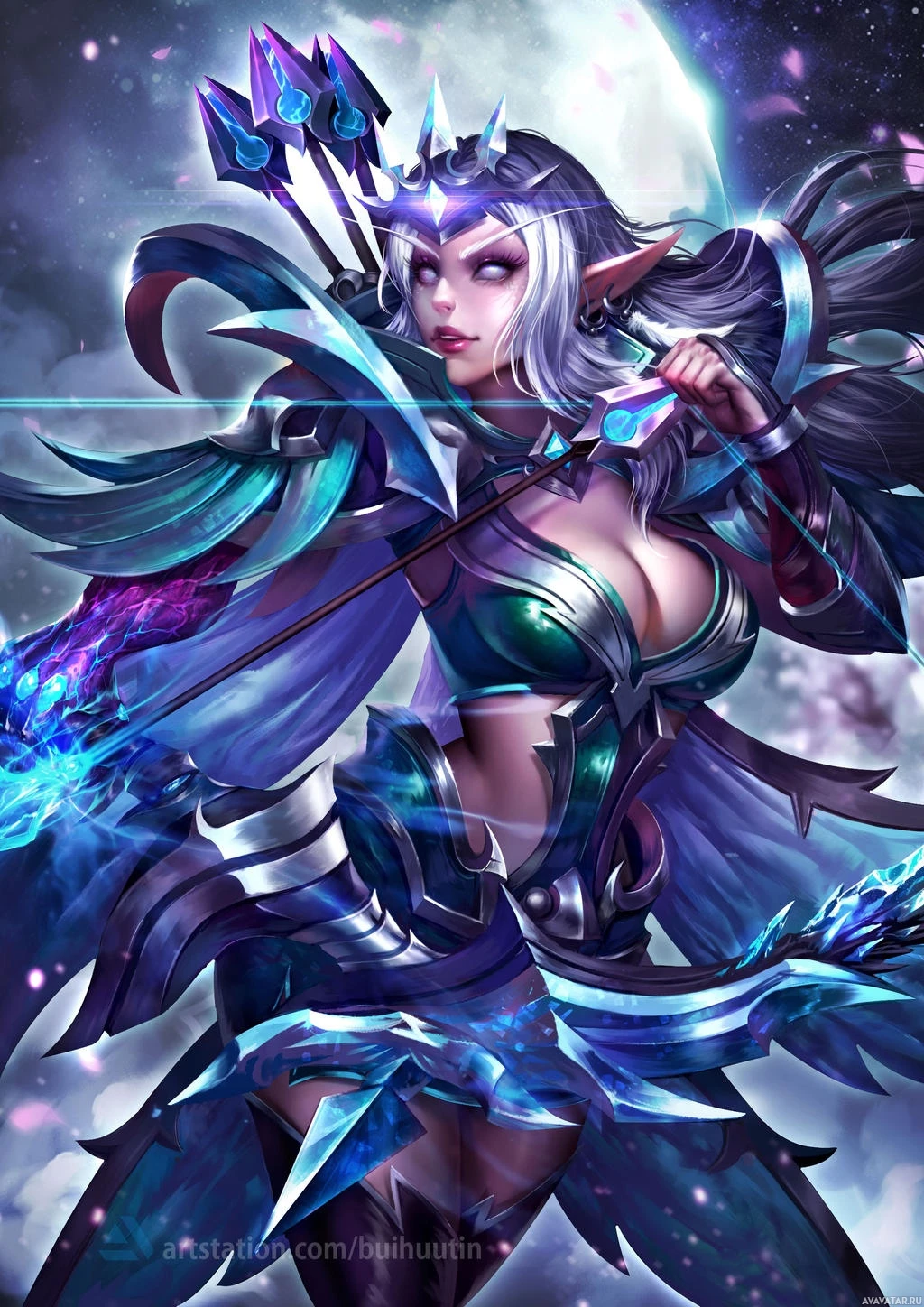 a dynamic pose with one arm wielding a bow, suggesting she's ready to fire it. Her attire includes a costume that incorporates various fantasy elements, such as crystals and magical-