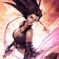 The image depicts a female character with purple hair, dressed in a dark outfit that appears to be inspired by fantasy or superhero attire. She has an expression of determination and is holding what seems to be a magical or energy-based weapon in her right hand. The background features vibrant colors that give the impression of a powerful or magical energy emanating from the character. The style of the image suggests it could be from a comic book or graphic novel.