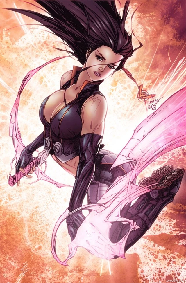 На картинке изображена женщина с фиолетовыми волосами, одетая в темный наряд, который, кажется, вдохновлен фэнтези или одеждой супергероя. Она проявляет решительность и держит в правой руке то, что кажется магическим или энергетическим оружием. Фон имеет яркие цвета, которые создают впечатление мощной или магической энергии, исходящей от персонажа. Стиль изображения предполагает, что это может быть комикс или графический роман.