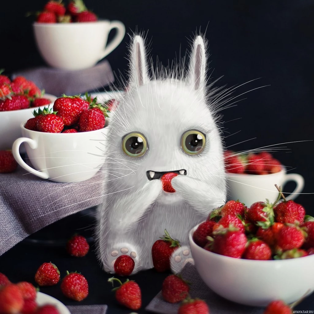 На картинке изображен белый кролик с большими выразительными глазами. Он сидит на вершине нескольких чаш, наполненных ярко-красной клубникой. Общая сцена предполагает причудливую или игривую обстановку, возможно, предназначенную для того, чтобы вызвать чувство удивления или восторга.