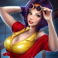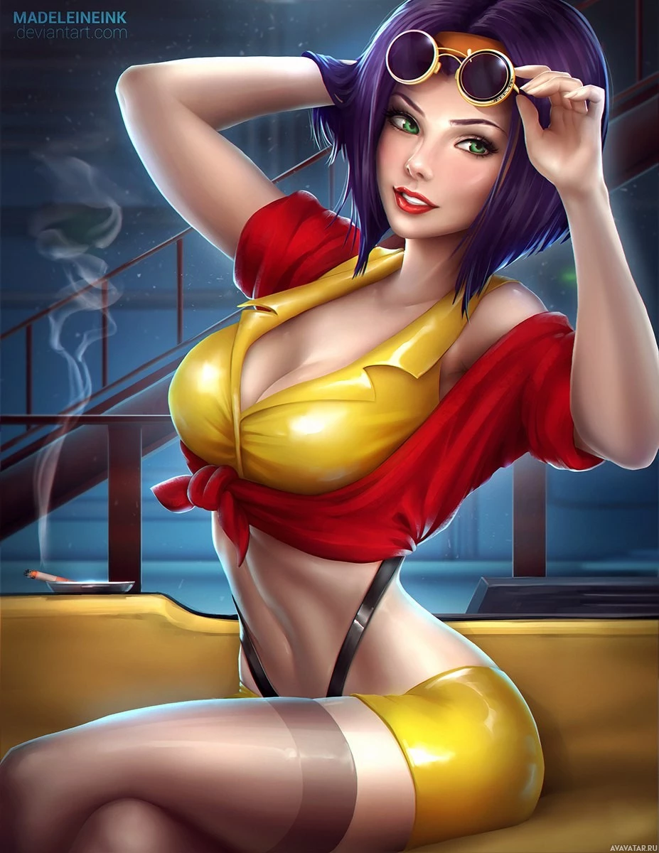 purple hair wearing sunglasses. She is dressed in a red and yellow outfit that resembles a firefighter's uniform. Her pose suggests she is relaxing or enjoying her time, perhaps on a boat given the surrounding details that include a railing and what appears to be