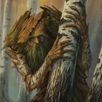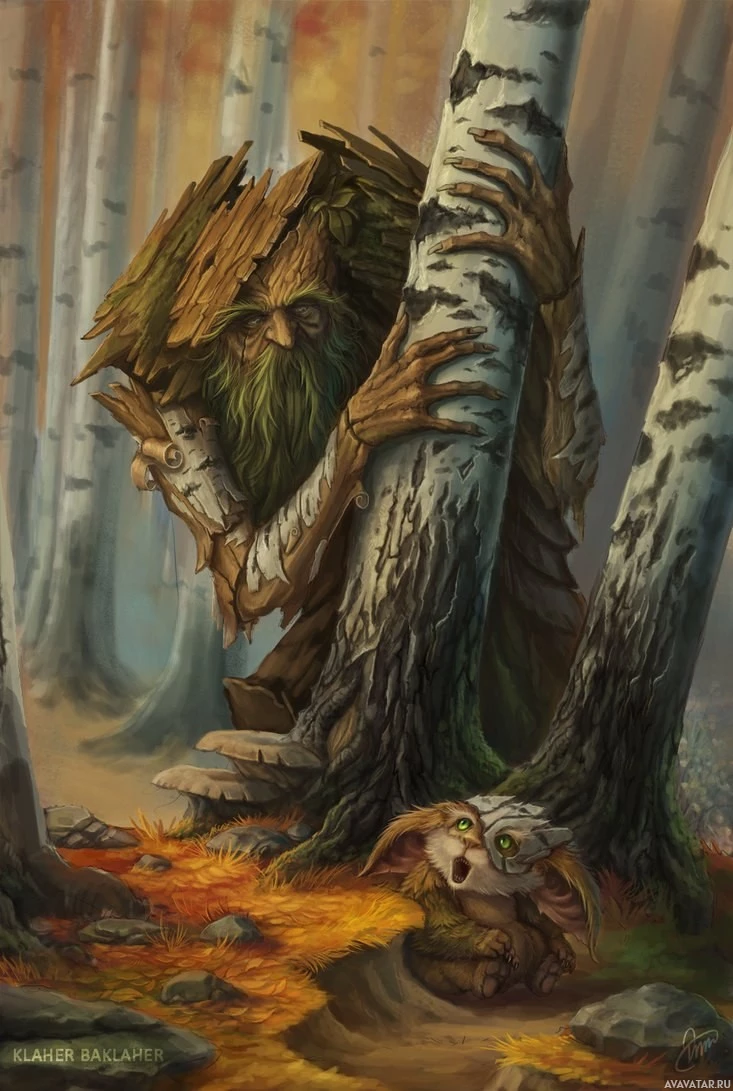 forest scene with several elements characteristic of a fairy tale or fantasy artwork. There is an anthropomorphic creature that appears to be a combination of human and tree, resembling