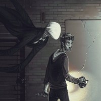 The image depicts a scene with a person standing inside what appears to be an abandoned or dimly lit room. On the right side, there is