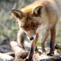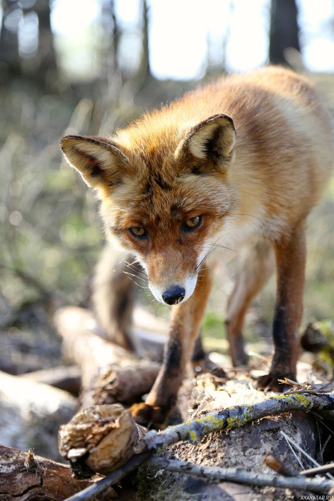 a red fox standing on what appears to be a bed of branches or fallen tree limbs. The fox is looking directly at the camera, with its ears perked up and