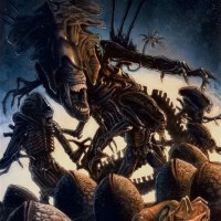 central character are smaller creatures, which appear to be young Xenomorphs or possibly other types of alien creatures from the series. The background suggests