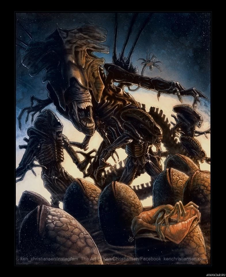 movie franchise. In the center, there's a large creature that resembles an Alien Xenomorph with its distinctive long mouth,