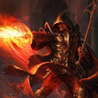 a magical fire-like energy emanating from his fingers. The background has a fiery and chaotic appearance, suggesting an intense or supernatural event. The image also contains text at the bottom, possibly indicating the source of the artwork, such as a logo for "Lore Craft."