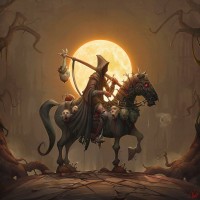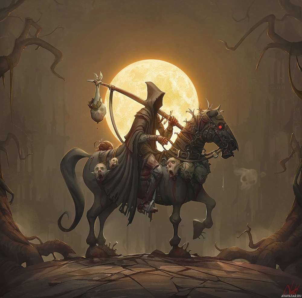 The image shows an illustration of a character riding a horse in what appears to be a gothic or horror-themed setting. The character is wearing a hood and has