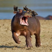 На снимке изображен бегущий на песчаной земле гиппопотам с водой на заднем плане. На его спине сидят птицы, и он, кажется, делает вокализацию или, возможно, зевает с открытым ртом. Это уникальное взаимодействие между дикой природой, запечатленное на фото.