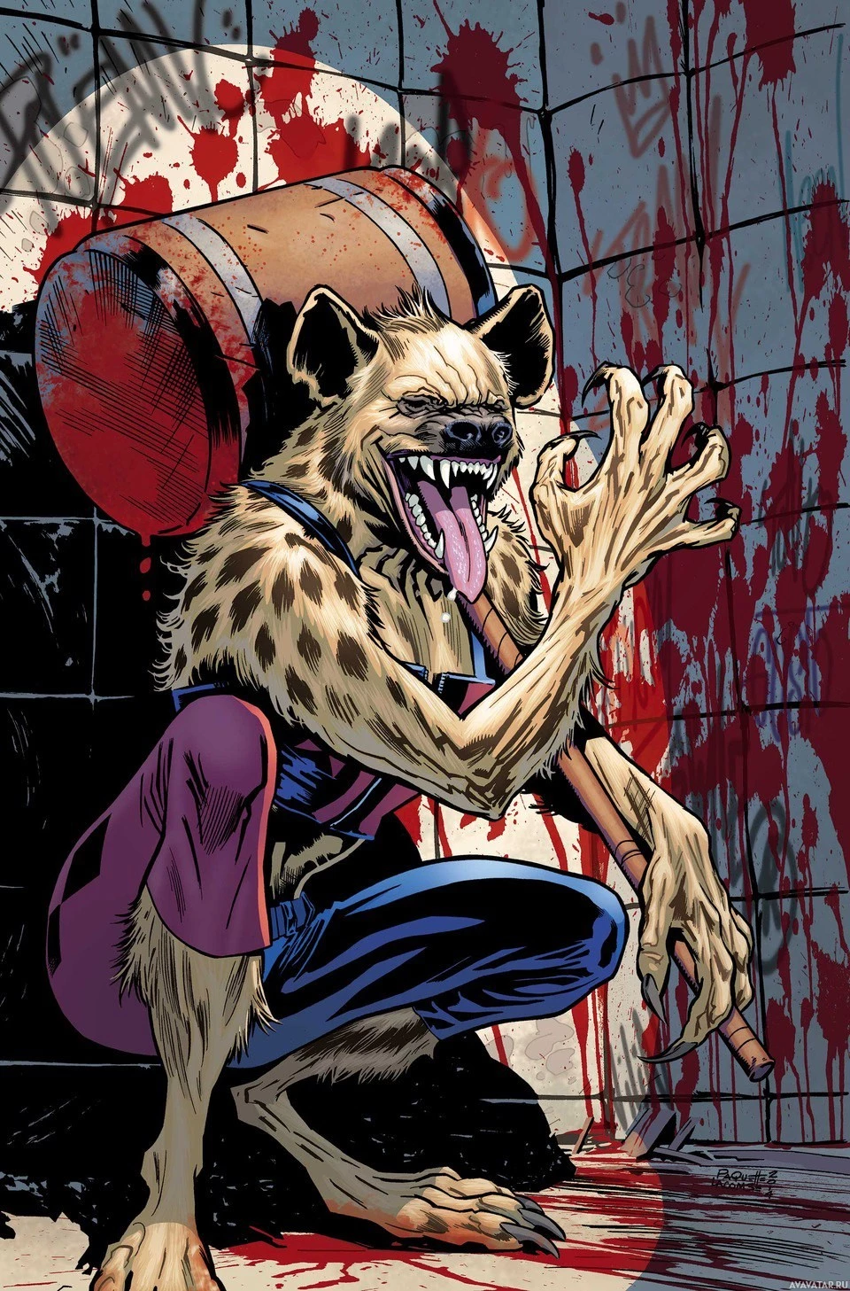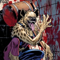 The image depicts a character that appears to be a hyena with human-like features, such as wearing clothes and sitting upright like a person. It has