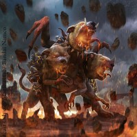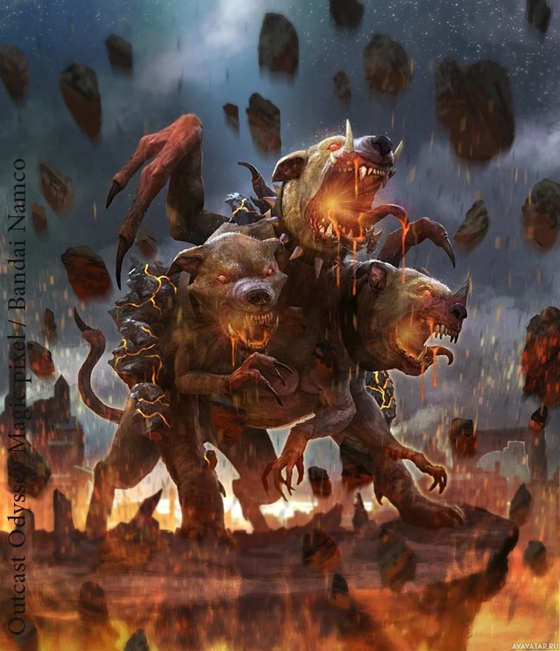 a fantastical creature that appears to be a three-headed dog, resembling the mythological Cerberus. It stands on what looks like a volcanic or fiery