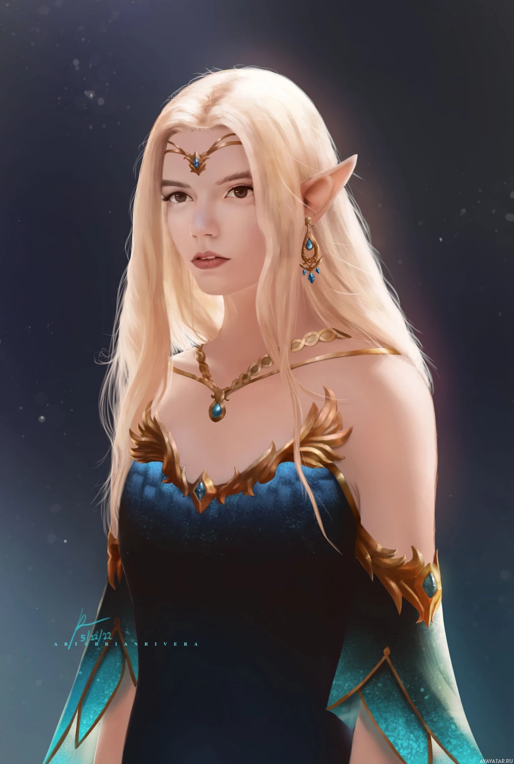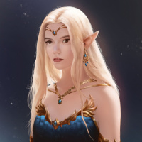 a serious expression on her face and stands against a background that suggests a fantastical setting, perhaps a kingdom or a realm inhabited by beings like herself.