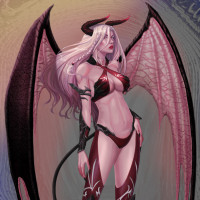 long hair, but the lower body of a dragon or demon with wings and tail, all in a stylized artistic rendering typical of fantasy artwork. The character is adorned with