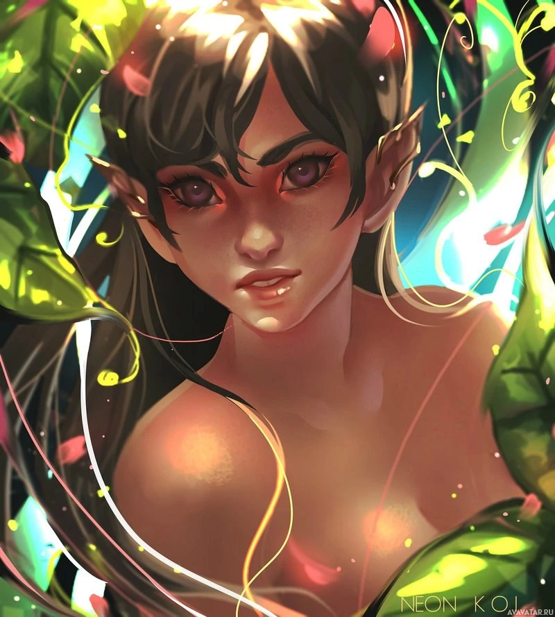 a natural setting that includes lush green leaves and foliage, which could be part of an elven forest or garden. There are also some magical or otherworldly elements surrounding the character, such as glowing particles or energy that seem to emanate from within them, adding to