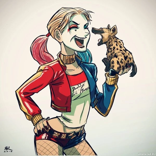 Harley Quinn from the DC Comics universe, known for her role in the Batman series. She is depicted wearing a red and blue costume with