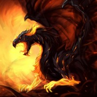 The image depicts a fantasy-themed illustration of a dragon. The dragon appears fierce and is surrounded by fire, giving it
