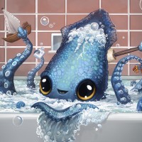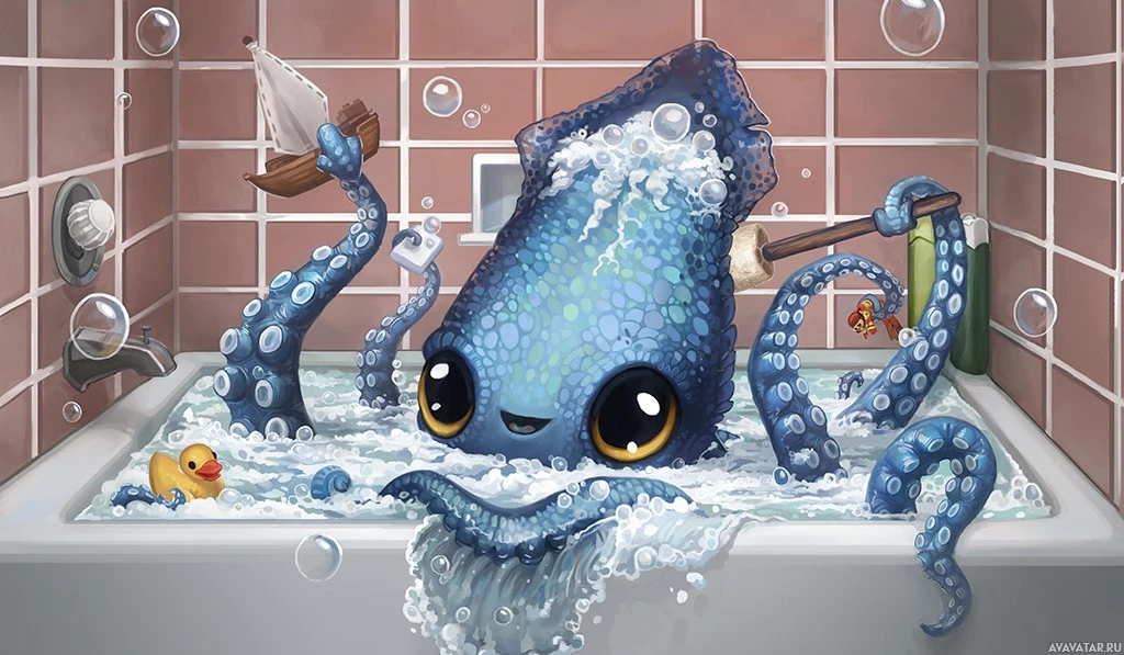 На картинке изображен анимированный осьминог, сидящий в ванне, заполненной пузырьками. Осьминог антропоморфизирован, что означает, что он имеет человекоподобные характеристики, такие как способность сидеть прямо и участвовать в человеческой деятельности, такой как купание. В ванне также есть рыба и резиновая утка, добавляющая к игровой сцене. Фон имеет черепичные стены, типичные для ванной комнаты.