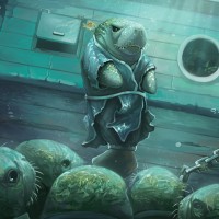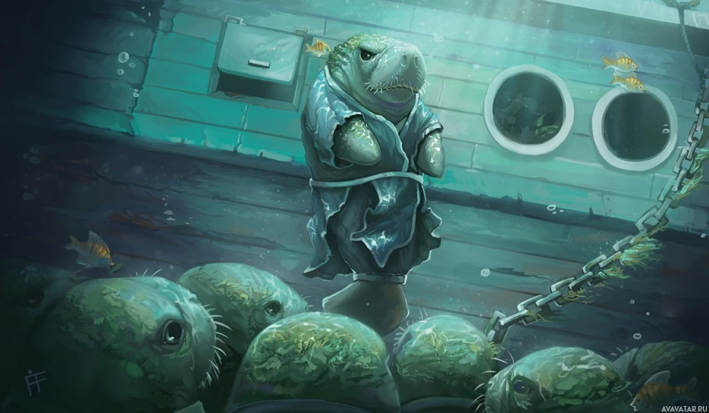 an underwater scene featuring a character that appears to be a human or anthropomorphic creature wearing an aquatic suit and sitting on what looks like a pile of eggs. The environment suggests an aquarium setting, as indicated by the glass panel in the background with three circular windows through which the outside world can be seen, suggesting this is a controlled habitat for