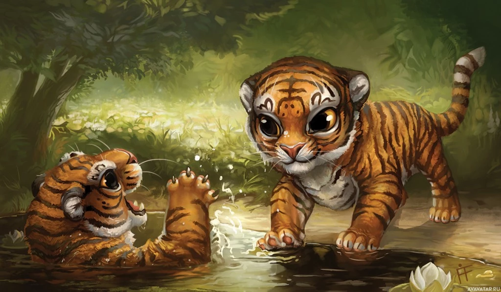 The image depicts two tiger cubs interacting with each other in