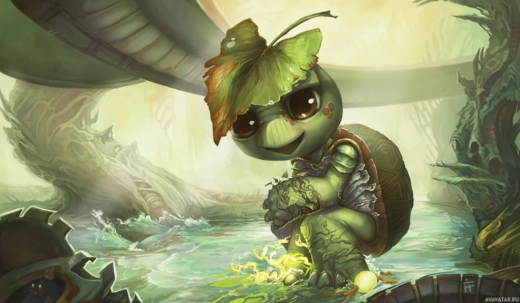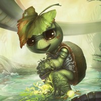 lush greenery and some ruins in the distance, which could imply a storyline or setting for this turtle character.