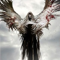 a figure with wings, resembling an angel, but the wings are torn and bloodstained. The figure is shown against a dark,