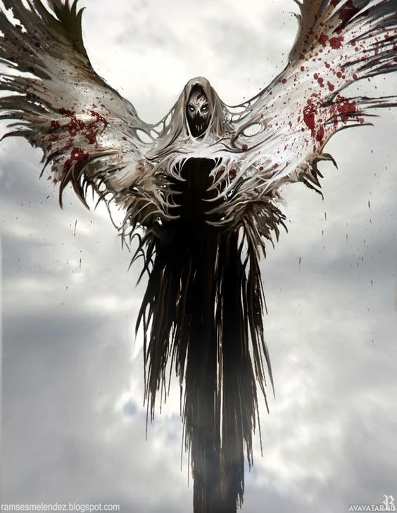 a sense of horror conveyed by the combination of the wings and the dark, menacing atmosphere. This image could potentially be associated with themes related to angels, wings, horror, or