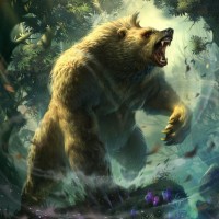 brown bear, standing in an environment that resembles a dense forest. The bear is depicted with its mouth open as if it's roaring or growling. The scene has a fantastical and somewhat dramatic feel, likely designed for artistic or