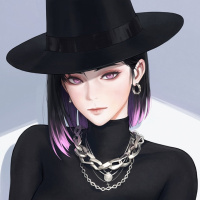 На картинке изображен анимированный персонаж, который является девушкой с чёрными волосами. Она носит большую черную шляпу, которая выделяется. Ее одежда состоит из черного верха и нескольких цепей на шее. Стиль предполагает, что она может быть из серии аниме или манги.