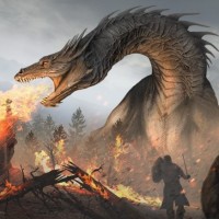 breathing fire. In the background, there is a setting that suggests a battlefield with trees and